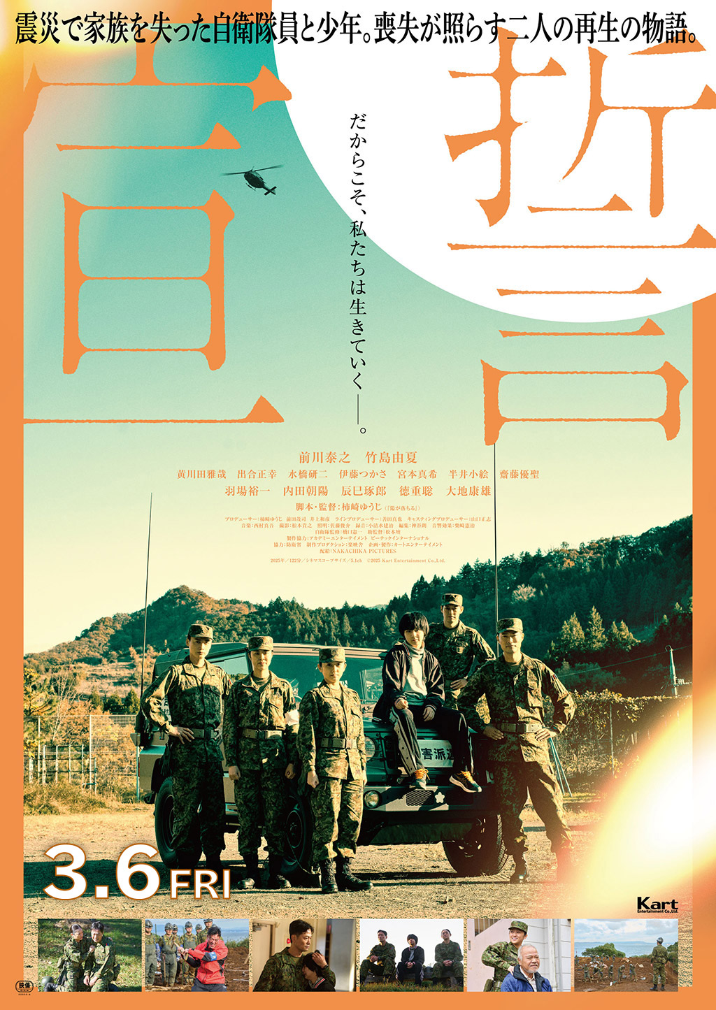 『陽が落ちる』でも忘れがたい存在感を残した前川泰之が、津波で妻と幼い娘を失いながら任務に立ち続ける自衛隊員・春日三尉を、静かな力を秘めた演技で息づかせる。舞台は東日本大震災の被災地。避難所支援に従事する春日は、深い痛みを抱えながらも、人々と正面から向き合う日々を過ごしていた。そんな中で出会うのが、両親を亡くし心を閉ざした少年・吉村和樹。立場も年齢も違う二人だが、失ったものの大きさは同じだった。静かな日常の積み重ねのなかで、春日は少年に、少年は春日に、寄り添いあうようにして再び“生きる力”を取り戻していく。 本作は、陸上自衛隊の全面的な協力のもと、震災当時の現場に限りなく近い緊張感と空気感を映像に刻み込むことに成功した。過酷な現実の只中にあっても、確かに存在する希望を描き出す、人間の再生をめぐるヒューマンドラマである。